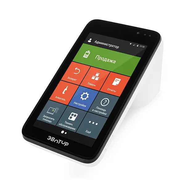 ОписаниеЭвотор 7.3 Смарт терминал без ФН — ККТ для любых сфер деятельности, не требующих наличия фискального накопителя. К устройству можно подключить дополнительное оборудование для чего встроены 5 х USB, 2 х COM и RJ-11. Питание устройства осуществляется от адаптера 5 В или от аккумулятора 2600 мАч х 4 для автономной работы на протяжении 8-14 ч. Терминал оснащен сенсорным экраном 7″, также встроен навигационный модуль GPS и камера 5 Мп. Для беспроводной передачи данных можно использовать Wi-Fi, Bluetooth 4.0, GSM 2G, 3G, а также проводной интерфейс Ethernet. Допускается подключение к интернету посредством mini-SIM карты мобильного оператора. Устройство печатает чеки шириной 57 мм, скоростью до 90 мм/с.