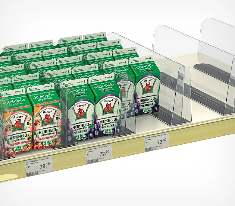 ОписаниеУниверсальный разделитель высотой 150 мм с нижним Т-профилем с магнитным основанием и передним ограничителем на всю высоту разделителя. Передний ограничитель предотвращает выпадение товара с полки. Применяется для выкладки и организации крупногабаритных товаров. Установка на полку без крепежных аксессуаров. Конструкция обеспечивает простоту применения - разделитель прижимается к полке товаром и действием магнита. Может использоваться в комбинации с задней опорой BACK-XL-TM. Материал - ударопрочный пластик. Ширина основания - 60 мм.