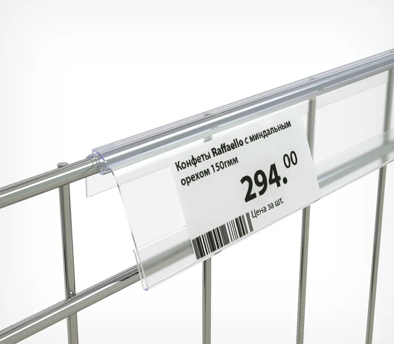 ОписаниеЦенникодержатель предназначен для размещения ценников на сетчатых полках, корзинах распродаж, дисплеях из металлической проволоки. Конструкция профиля позволяет закреплять его на металлических прутьях и при необходимости легко откидывается вверх для удобного вынимания товара с полки.