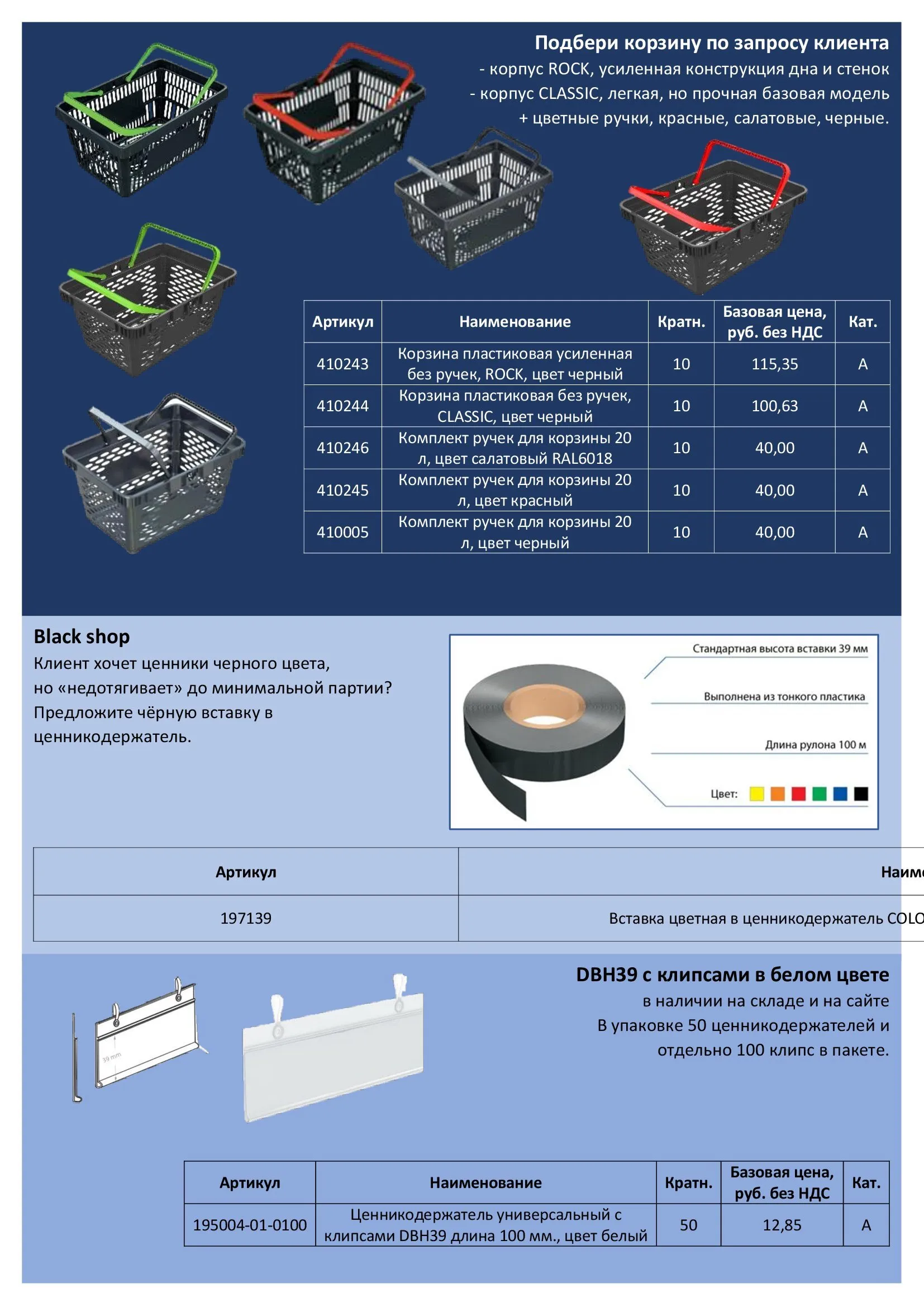 | 195004-01-0100 | Ценникодержатель универсальный с клипсами DBH39, длина 100мм, цвет белый | 50 | 12,85 | А |